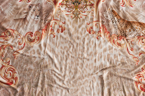 Elevated casual wear reimagined with soft-spoken animalia, the Palazzo Party Jersey Tank Dress is enveloped in a soft ivory leopard print defined with gold baroque detailing, the blossom of palm trees and the subtle sight