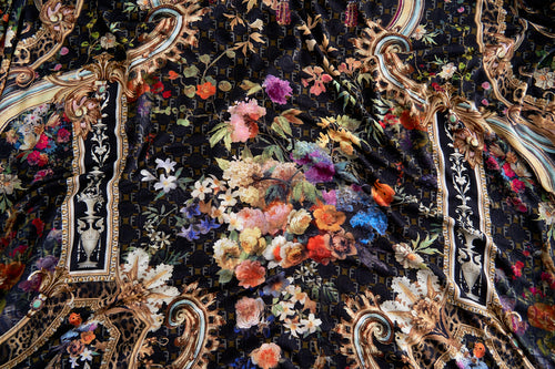 The A Gift From The Baron V Neck Active Crop is imbued with opulent accents fine gold filigree and soft florals set against a rich black backdrop. Adorning compression support and anti-pilling technology, this luxury