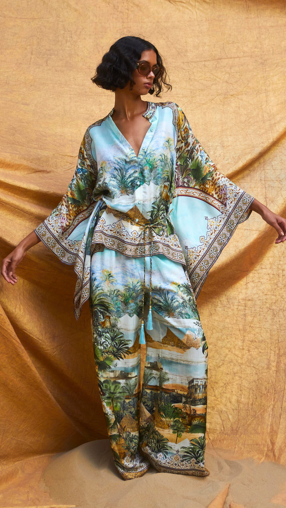 Designed in Australia, The Views Of The Valley Mens Full Length Robe is a celebration of the majestic architecture of Egypt’s grand palaces and the verdant beauty of its surrounding valleys. Lovingly handcrafted, this luxury mens robe showcases a relaxed fit silhouette with a shawl collar upon the open neckline. With a wide waist tie and contrast cuffs this Hotel Franks By CAMILLA mens robe is perfect for lavish layering.