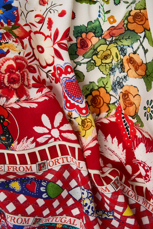 Designed in Australia, The Faith, Luck & Justice Short Kimono Wrap draws you into the heart of Portuguese folklore—where the Barcelos Cockerel and vibrant fish motifs dance among colourful blooms and kitchy textiles, capturing market