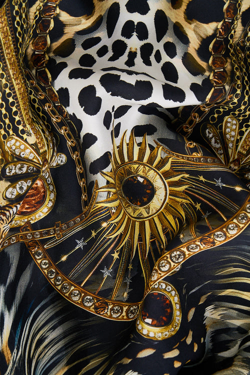 The Feline Folklore Long Split Front Twist Dress is a handcrafted silhouette designed by our in house artisans. Reimagined in an exclusive limited edition print, our maxi front twist dress features a v neckline and