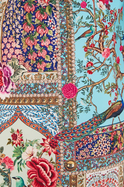 The Sultans And Queens Button Dress With Shaped Waistband is a handcrafted silk silhouette designed by our in house artisans. Reimagined in an exclusive limited edition print, our full length dress features a deep V neckline and shaped waistband that sculpts the feminine form. Finished with front button closure and intricately applied crystal embellishments.