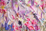 The Sonic Symphonies A Line Gathered Panel Dress meanders through a field of painterly florals. Dance amidst ornate golden flourishes accentuated with delicate strands of iridescent pearls. Adorned with hand-placed crystal embellishment, this luxury silk