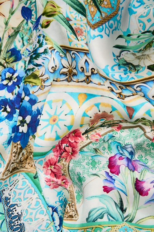 Designed in Australia, The Sunrise In Sintra Off Shoulder Short Dress celebrates lush gardens and eclectic nineteenth-century architecture, where light blues and intricate tiles reflect exotic motifs, inviting you into botanical beauty. Lovingly handcrafted, this