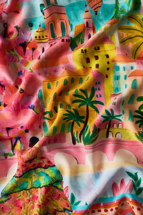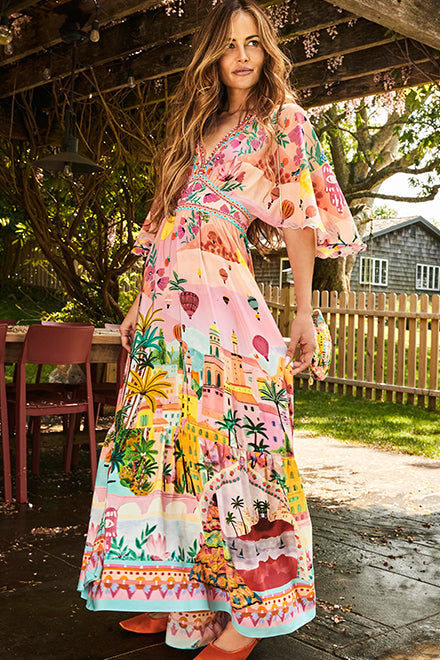 The Sister Sunset Waisted Dress With Hem Ruffle wanders into a sunset tableau, where delicate hues of pink, orange, and lilac converge in a stunning display of hot air balloons soaring above desert palms and grand mountains. Adorned with elegant floral motifs and scenic tapestry, this wearable artwork embodies femininity and symbols of profound protection and strength.This luxury silk maxi dress boasts a beautifully feminine silhouette, adorned with CAMILLA signature hand-embellished crystals. It features a shaped waistband with back shirring to sculpt the curves, floaty draped statement sleeves, functional pockets, and a wide ruffle along the full-length hemline