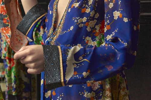 A creative evolution of her heart's greatest desire, the Maikos Midnight Cross Overlay Halter Dress reveals a bejewelled print of Japan's delicate foliage and ornamental silk fans. Crafted from sumptuous silk in a floor-skimming silhouette,
