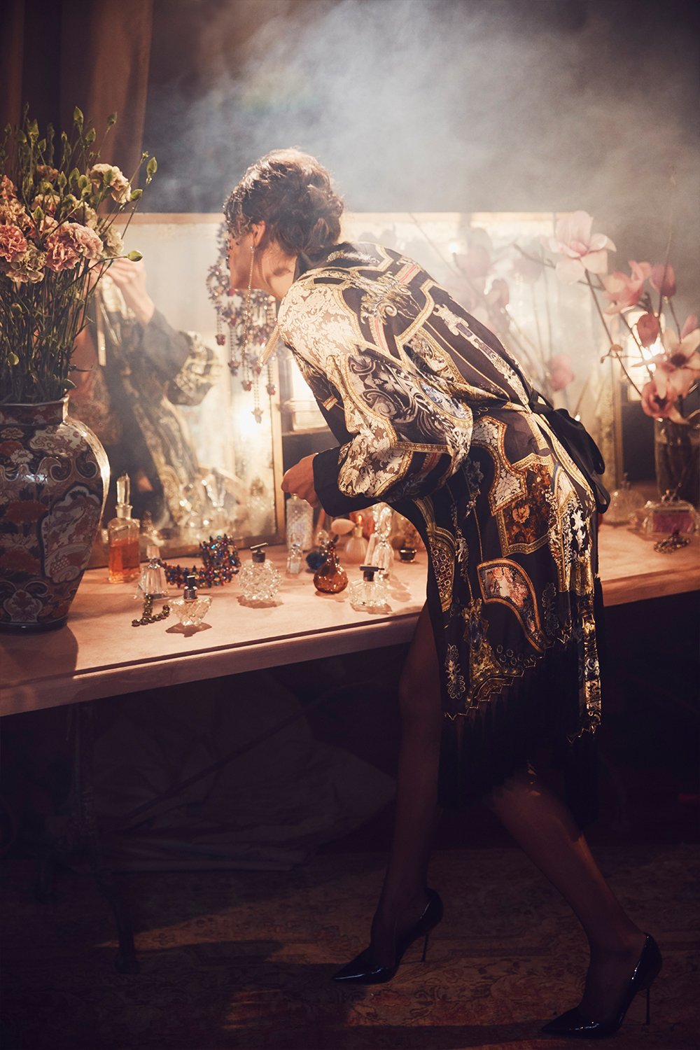 Reminiscent of the royal hues of FontainebleEU, the Midnight Meeting High Low Hem Layer with Cuff is a modern taken on the fashion and furnishings of French chateEUx. This luxurious printed robe is adorned with